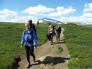 Frukosten på Blåhammaren var en stor buffé av läckerheter. Högst tronade de nybakade, varma småbröden med lingon på, men allt var gott och maten lade sig till rätta i magen så som den bara kan göra på hungriga fjällvandrare. Med en magstatus som låg farligt nära matkoma gav vi oss av mot Sylarna, en 19 kilometer lång vandring i lera varvat med fjällvärldens motsvarighet till motorväg. Här och var låg snön kvar och många vattendrag fick vi korsa på föga förtroendeingivande snöbroar. Vid ett tillfälle klev både Amelie och Agnes rakt igenom en av dessa och Amelie fick till följd av detta erfara hur det är att göra "sälen" med fjällvandringsryggsäck. Vi skrattade och fotograferade som de goda vänner vi är.